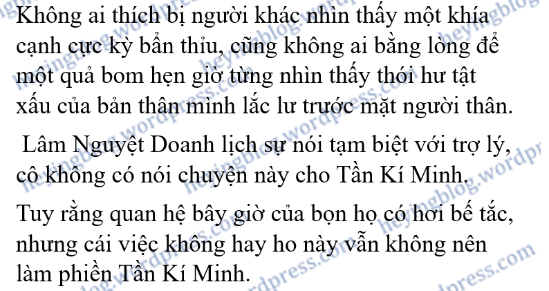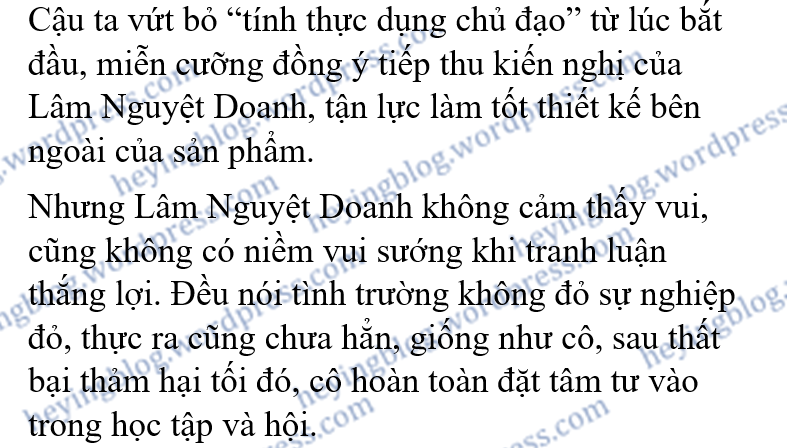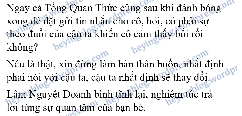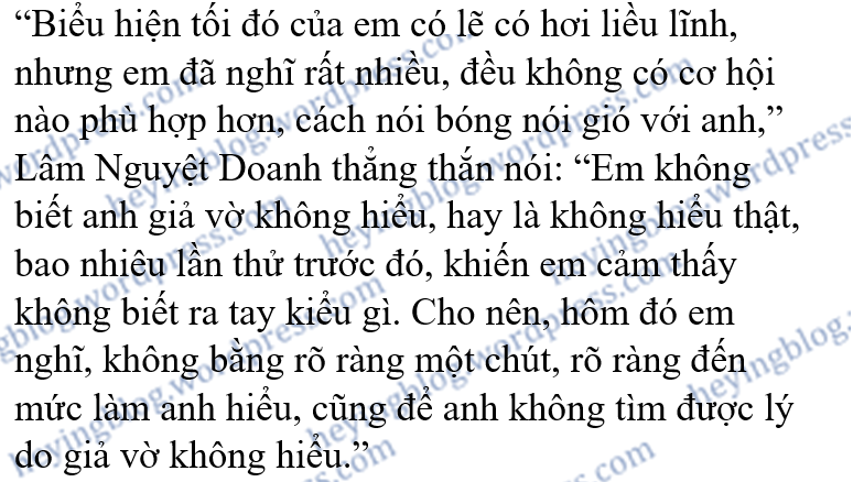 “Đừng cố ý giả vờ không nghe thấy gì,” Lâm Nguyệt Doanh nói, “Tình yêu của em không phải sợ bị người khác biết, chỉ là lo ngại về đạo đức mà thôi.”
