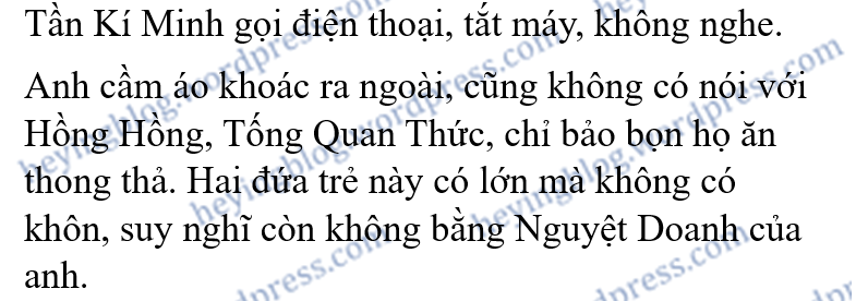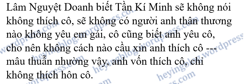 “Không phải em muốn ngủ với anh,” Lâm Nguyệt Doanh nói, “Thực ra hôm đó ý em muốn nói là em thích anh, cho dù sau này chúng ta không ngủ với nhau, em cũng sẽ thích anh cái kiểu thích đó, anh thực là người may mắn, Tần Kí Minh, em tốt thế này mà lại thích anh như vậy.”