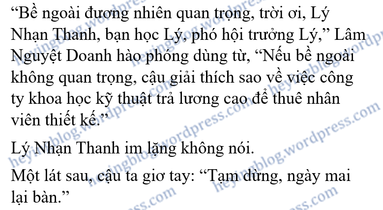 Lâm Nguyệt Doanh đứng lên, hai tay chống bàn: “Chuyện hôm nay chớ để ngày mai, đừng nghĩ trốn tránh hiện thực, bạn học Lý Nhạn Thanh, mời cậu ngồi xuống.”