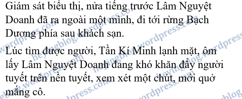 Hai người sóng vai đi, trên mặt tuyết, vết dấu chân sâu sâu nông nông, một lớn một nhỏ, Tần Kí Minh đỡ Lâm Nguyệt Doanh, bông tuyết rơi đầy trên áo.
