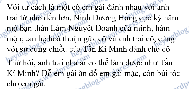 Về đến nhà, Ninh Dương Hồng nhìn anh trai chỉ biết chơi game, và “em gái ơi anh hết tiền rồi”, loại so sánh khập khiễng này khiến cô nàng vô số lần cảm thán cùng là em gái mà không cùng mệnh.