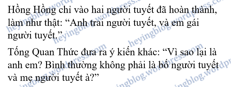“Vậy thì đừng rối rắm như thế đi, cứ gọi chúng nó là Adam và Eva, hoặc là, Nữ Oa và Phục Hy,” tay Lâm Nguyệt Doanh dán trên đầu người tuyết, thân mật cọ cọ, cô quay mặt, cười toét miệng với mấy người họ, “Izanagi và Izanami (*).”