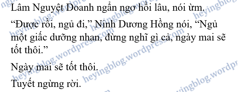 “Doạ chết tớ rồi,” Ninh Dương Hồng chắp hai tay lại, làm động tác vái vái, đau lòng đi tới ôm cô, “Tống Quan Thức chạy qua hỏi tớ mấy lần về câu, tớ không dám nói cậu chạy rồi. Bằng không, với cái não đó của cậu ta, nói không chừng nóng đầu chuồn ra ngoài mất. Tớ sắp căng thẳng muốn chết… ya, có phải bị doạ rồi không? Có phải bị doạ rồi không Tiểu Doanh Doanh ngoan ngoãn của tớ, cục cưng Nguyệt Nguyệt của tớ, sao cậu vẫn khóc vậy? Coi cái mặt nhỏ này, bị lạnh cóng hết rồi… á, cái tay này, sao lạnh thế…”