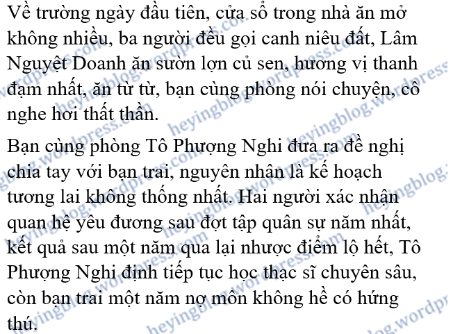 Cô không kể cái chuyện xấu hổ này, nhất là sau đó Tô Phượng Nghi đón nhận sự theo đuổi của đối phương, vả lại sau thấy tình cảm không tồi. Hiện giờ Tô Phượng Nghi có ý định chia tay, Lâm Nguyệt Doanh cũng không nói ra, chỉ tán đồng lựa chọn của bạn cùng phòng.