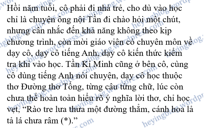 (*) Giải nghĩa: Bên cạnh hàng rào tre lưa thưa có một đường mòn tĩnh mịch, cánh hoa trên cây bên đường bay bay trong gió, chồi non mới lớn vẫn chưa thể tạo thành bóng râm của cây.