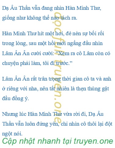 Hàn Minh Thư thấy tâm trạng cô ta không tốt, cũng không nói gì, chỉ ngồi đối diện cô ta, rồi nói nhỏ nhẹ: “Không sao chứ? Muốn tới công ty tôi ngồi một lát không?”