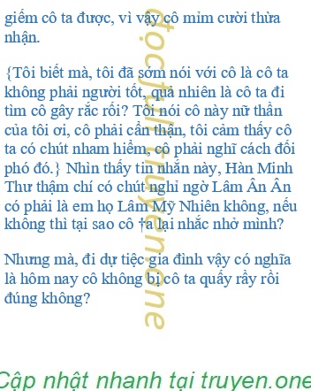 {Đã giải quyết xong mọi chuyện rồi, muốn cảm ơn tôi thế nào đây?} Nhìn thấy tin nhắn này, đầu Hàn Minh Thư đầy dấu chấm hỏi, người này có vấn đề gì sao? Mọi việc đã giải quyết xong còn không biết xấu hổ muốn cô cảm ơn? Nếu không phải vì anh ta thì liệu có xảy ra nhiều chuyện như vậy không?