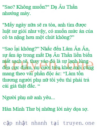 Sau khi cúp điện thoại, Hàn Minh Thư bước ra phòng vệ sinh, phát hiện Dạ Âu Thần đã quay lại chỗ của mình và ngồi xuống, lúc cô đi ra, ánh mắt thâm thúy của anh rơi trên mặt cô, vẫn đang nhìn chăm chằm cô.