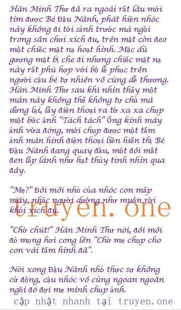 “Cô không trả lời câu hỏi của Bé Đậu Nành, ngồi ở đó bất động như người bị điểm huyệt không một cử động. Hơi lạnh từ chân gần như ngay lập tức lan ra toàn cơ thể Hàn Minh Anh khiến cô trở nên lạnh lẽo như trong động băng.
