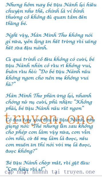 Bé Đậu Nành thấy cô đứng đó, liền chủ động đi đến nắm tay cô, nhưng kéo kéo mấy lần Hàn Minh Thư cũng không động đậy, thế là mềm giọng năn nỉ: “Mẹ, bé Đậu Nành biết lỗi rồi, sau này con sẽ không leo lên cao như vậy nữa”