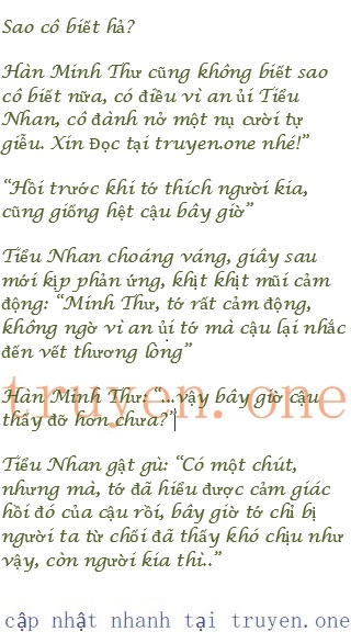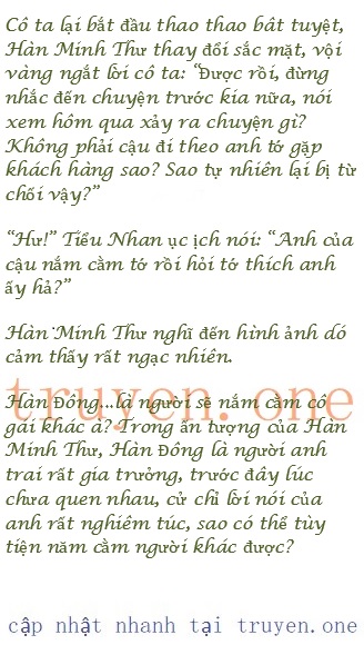 Cửa phòng đột nhiên bị đẩy ra, Hàn Minh Thư ngẩng đầu, nhìn đến gương mặt không cảm xúc của Tiểu Nhan, nụ cười cô biến mất tăm.