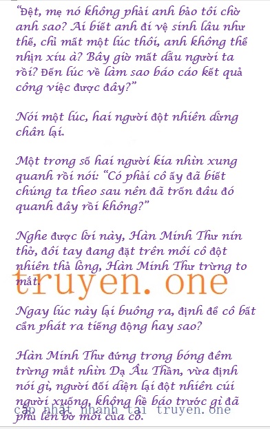 Nghe thấy tiếng bước chân đi xa dần, Hàn Minh Thư cũng dần dần yên tâm lại, mãi đến khi tiếng bước chân biến mất, Hàn Minh Thư mới lấy lại tinh thần định đẩy Dạ Âu Thần ra.