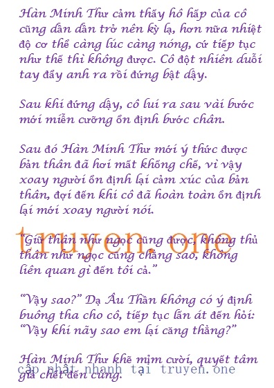 Có lẽ là vì lúc nãy anh vừa mới nói những lời đó, cho nên Hàn Minh Thư bất giác liếc nhìn về nơi nào đó của anh, phát hiện ra nói vẫn còn chưa trở về như bình thường, mặt cô lập tức đỏ bừng, đột nhiên lui ra sau.