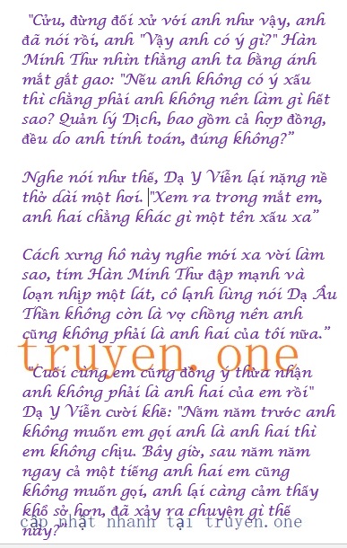 “Dạ Y Viễn” Hàn Minh Thư nhướng mắt nhìn anh ta, lần đầu tiên cô chính thức gọi tên anh ta: “Tôi mặc kệ giữa anh em các người có gì, nhưng sau năm năm tôi không muốn trở thành vật hy sinh trong cuộc tranh đấu giữa các người”
