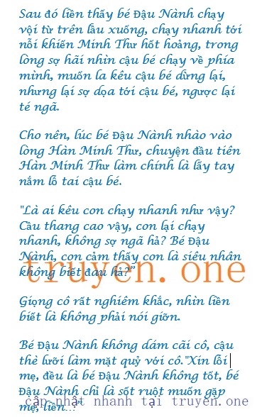 “Ừm!” Bé Đậu Nành uất ức bỉu môi, ánh mắt hơi ngập nước nhìn cô, ánh mắt này làm Hàn Minh Thư rất đau lòng.