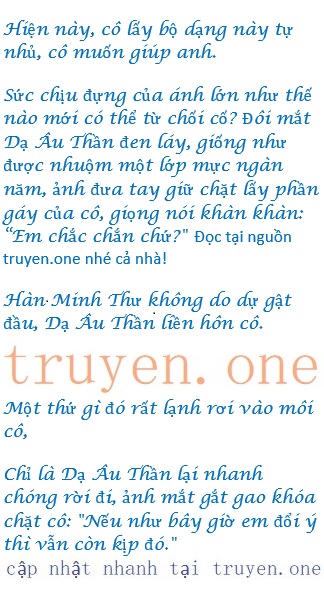 Khi Dạ Mục Thầm bé Hàn Minh Thư, Hàn Minh Thư ôm cổ của anh, tai đỏ như máu, cô khể nói nhỏ vào tại anh: “Anh nhẹ một chút ”