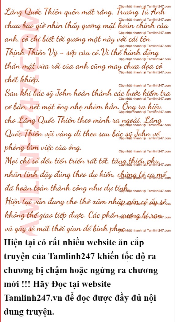 Như nhớ ra điều gì, Lăng Quốc Thiên vội vã bỏ tay cô ra, đứng thẳng sang một bên, nhường chỗ cho bác sỹ John tác nghiệp.
