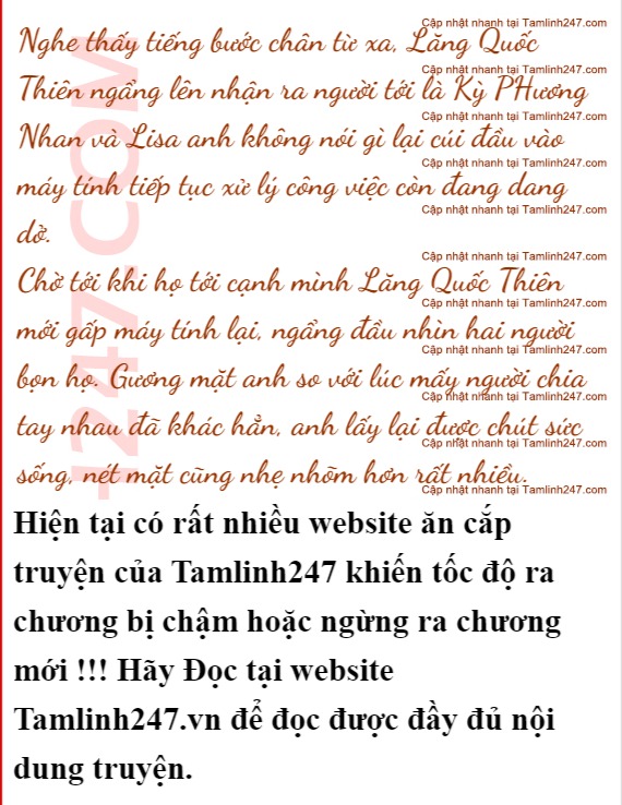 Anh nắng chiếu xiên qua gương mặt anh phản chiếu những đường nét cương nghị. Người đàn ông quyến rũ nhất chính là người đàn ông đang tập trung vào công việc Lisa thầm nhủ. Cô kéo tay Kỷ Phương Nhan bước nhanh tới chỗ Lăng Quốc Thiên.
