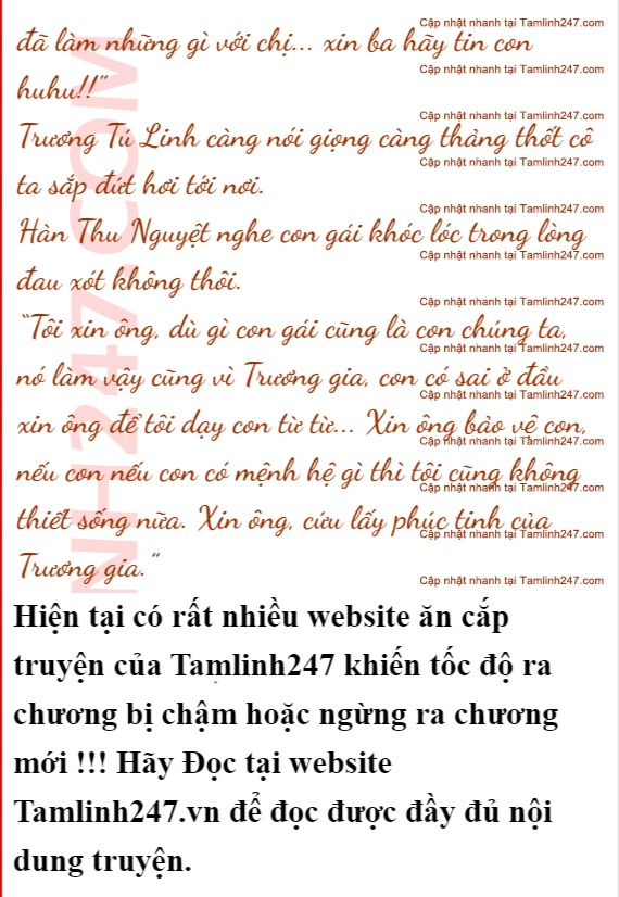 Bà ta vẫn chưa hết bàng hoàng trước những gì mình vừa chứng kiến, nhìn thấy gương mặt tức giận tới đỏ au của chồng, lại nhìn sang đứa con gái bà ta rất mực yêu thương đang quỳ sụp bên cạnh, khóc ngất. Không cầm lòng được, Hàn Thu Nguyệt cố gượng dậy quỳ xuống bên cạnh Trương Tú Linh, cô ta liếc sang thấy hành động của mẹ liền càng khóc to hơn.