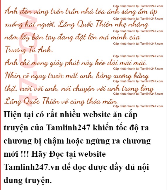 “Em biết rồi, không sao đâu. Thịnh Tổng”. Trương Tú Anh cố tình lấy hơi nhấn vào chữ Thịnh Tổng khiến Lăng Quốc Thiên bất ngờ.