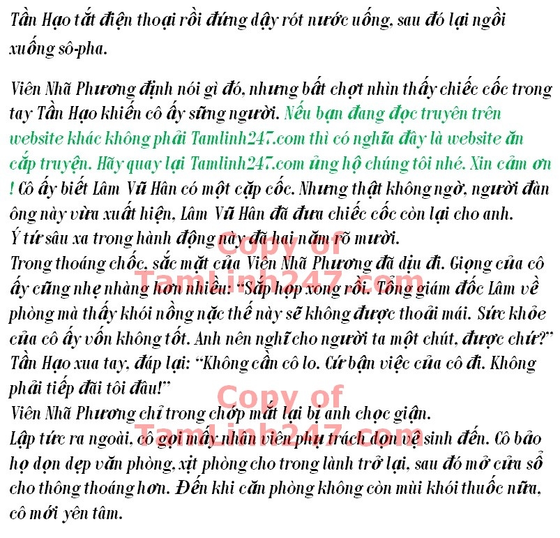 Cô ấy bình tĩnh đưa ông chủ Vương đến văn phòng của Tổng giám đốc, để anh ta ngồi ở đây chờ Lâm Vũ Hân. Sau đó, Viên Nhã Phương cũng vội vã ra ngoài.