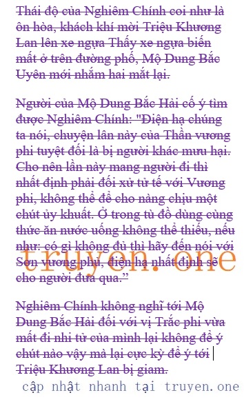 Giọng nói của Nghiêm Chính truyền thắng một mạch đến: “Thần Vương điện hạ, vi thần tuân lệnh mang Thần vương phi đi. Xin điện hạ để cho Vương phi đi ra đi.”