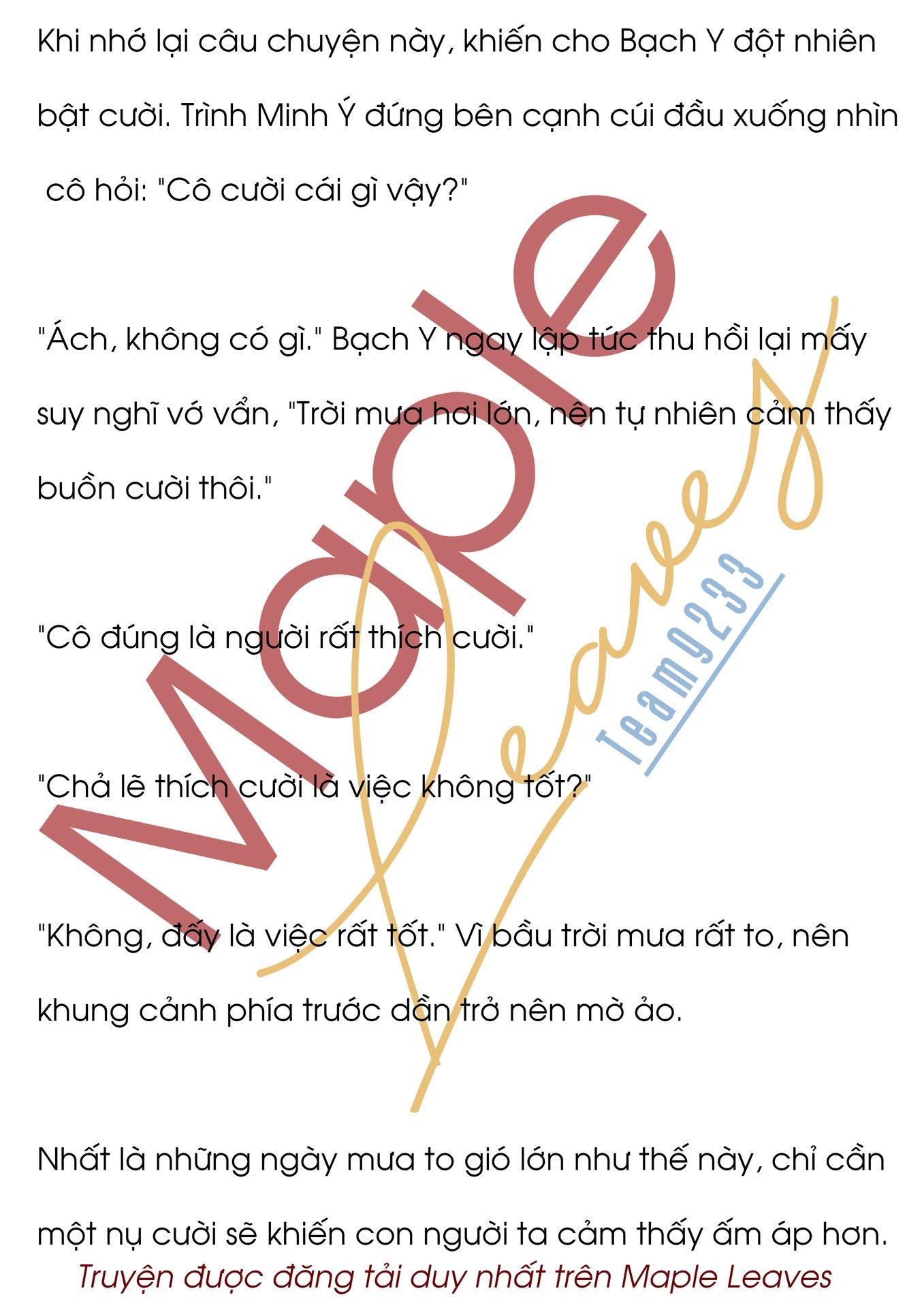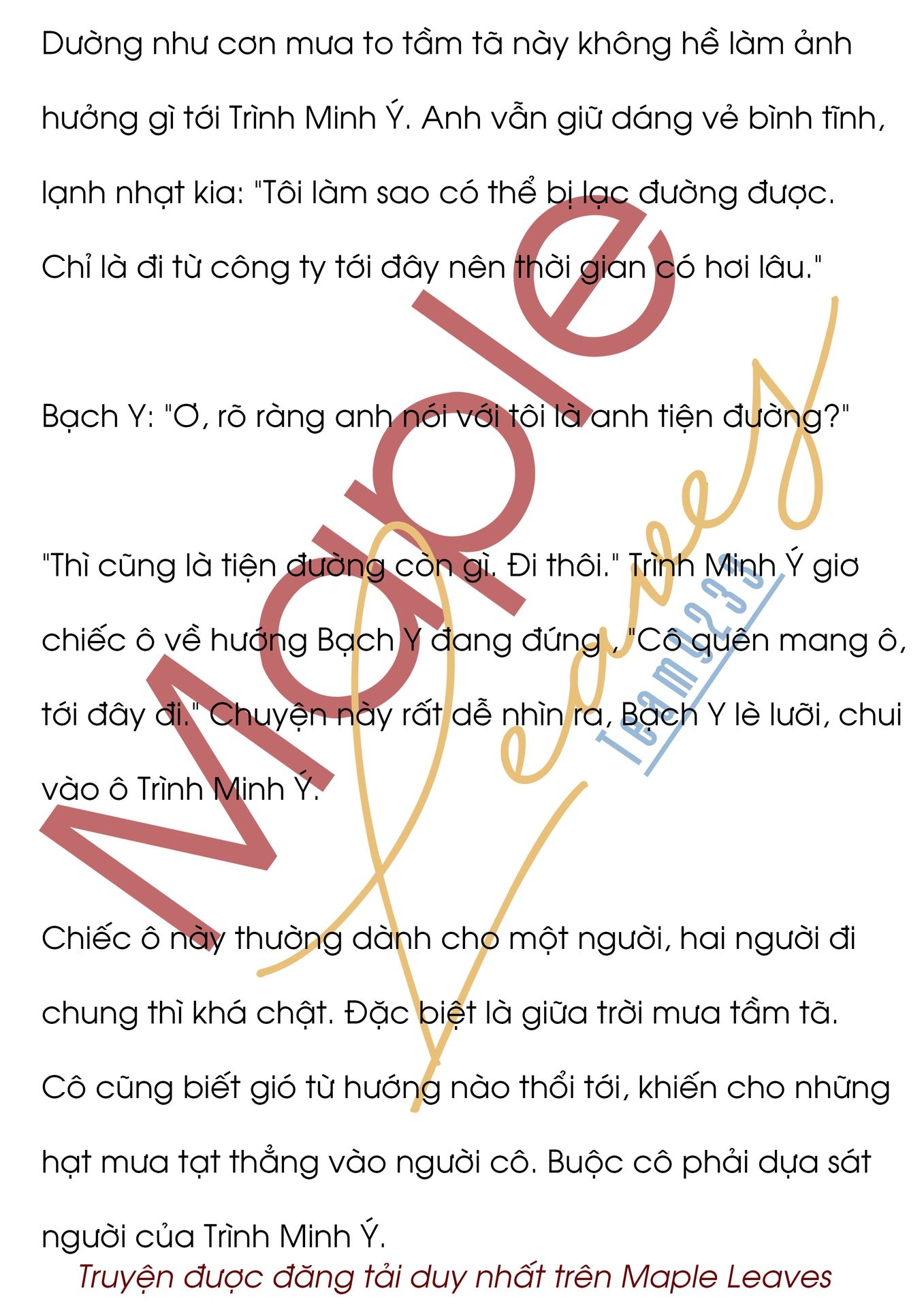Giọt mưa rơi xuống khiến ống tay áo bên trái của anh ướt một mảng lớn. Từ từ truyền tới một cảm giác rất mát lạnh. Cánh tay của Bạch Y để sát vào người của Trình Minh Ý. Không ngờ người có tính tình lãnh đạm lại có nhiệt độ cơ thể cao như vậy. Nhiệt độ trên người đối phương dù cách nhau qua lớp áo nhưng cô vẫn có thể cảm nhận được. Cảm giác đứng giữa cái nóng và cái lạnh thực sự rất tuyệt. Khiến cho cô lại bắt đầu suy nghĩ mấy chuyện linh tinh. Trong khuôn viên trường đại học mà cô từng học. Có tòa nhà dạy học cao mười mấy tầng. Ở phía trước toà nhà có một mảnh đất được nhà trường trồng rất nhiều hoa và cây. Nhà trường luôn cử người đến để chăm sóc cẩn thận các loài cây. Cô còn nhớ có người bán hàng rong chuyên bán ô vào lúc trời mưa. Anh ta còn khoe khoang những cái ô mà anh ta bán nó sẽ rất vững vàng trước những cơn gió mạnh trong trời mưa bão.