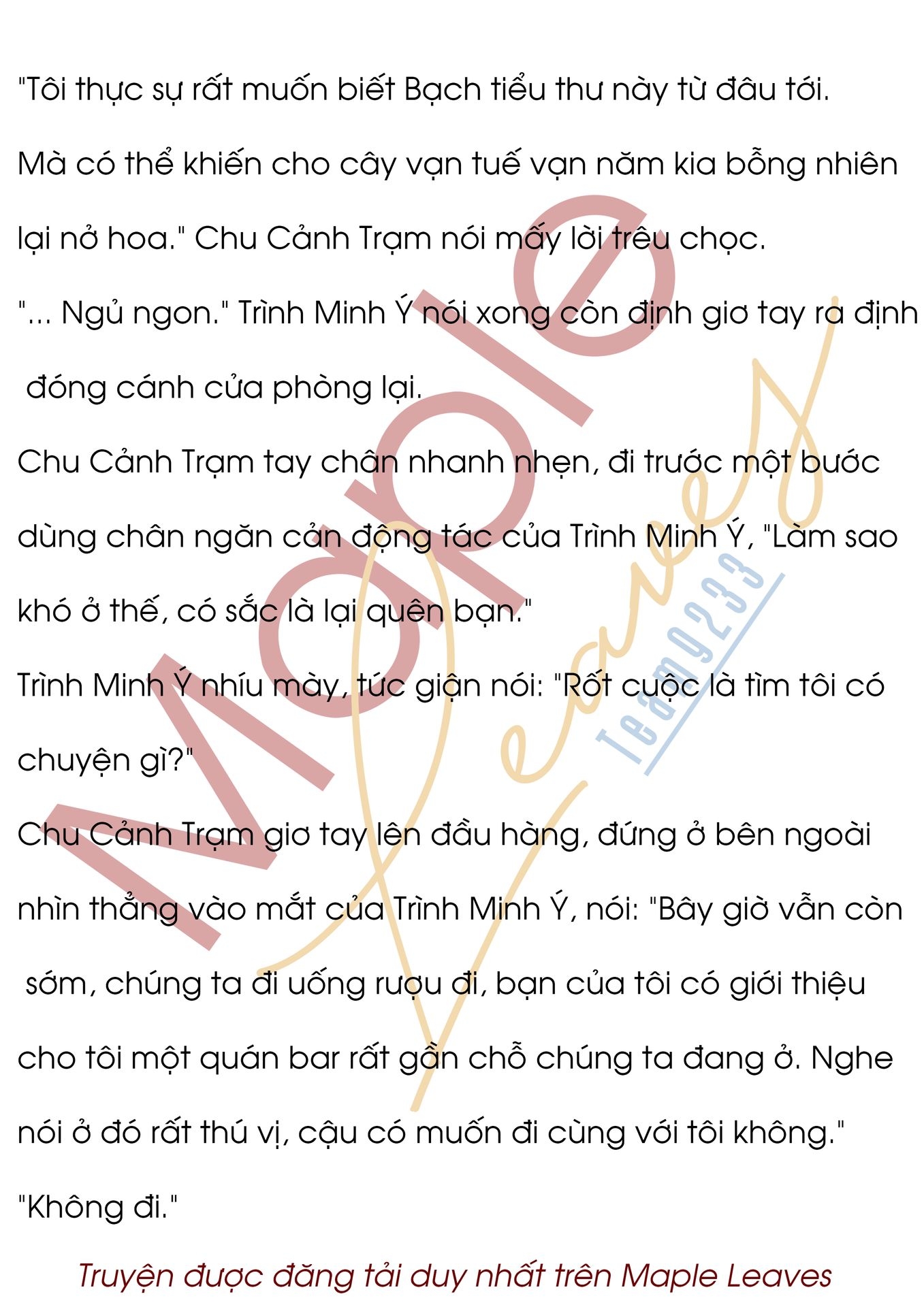 "Không đi, bạn gái tôi cũng kêu tôi phải đi ngủ sớm." Trình Minh Ý nói, "Sáng ngày mai cần phải đi khảo sát công trình. Nên ngủ ngon nhé Chu tổng."