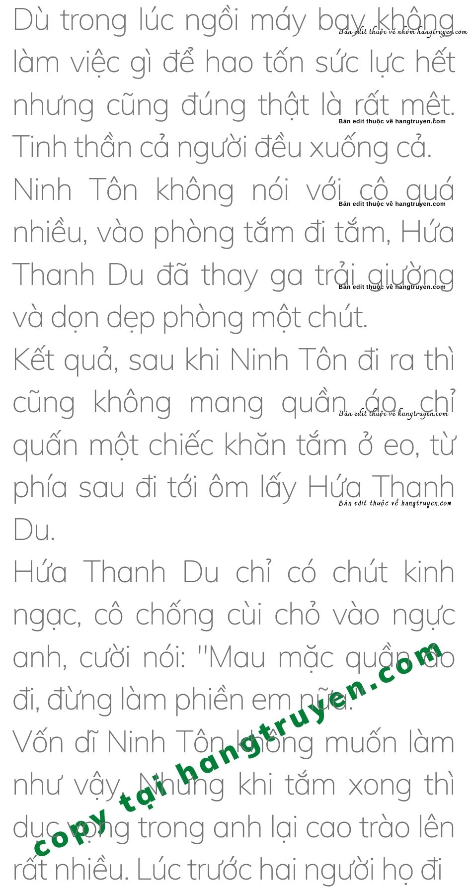 Ninh Tôn không quan tâm, tắm hay không cũng chỉ là chuyện nhỏ. Anh kéo hết áo quần của Hứa Thanh Du, “Vậy thì bây giờ hãy đi tắm. Anh không sao, anh có thể tắm thêm lần nữa, anh muốn cùng em tắm.”